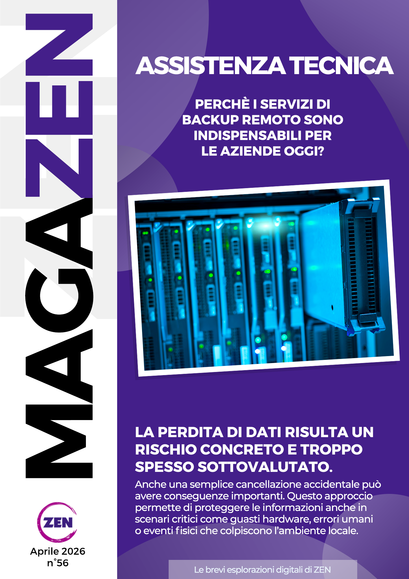 La nostra azienda informatica offre assistenza tecnica per PMI, sia da remoto che in presenza: si posiziona come partner IT completo, occupandosi non solo della risoluzione dei problemi ma anche di gestire e ottimizzare l’infrastruttura tecnologica aziendale. Zen srl propone infatti backup remoti come soluzione strategica per la continuità aziendale, salvando i dati fuori sede con un processo automatizzato (solitamente notturno) tramite sistemi sicuri e facilmente ripristinabili.